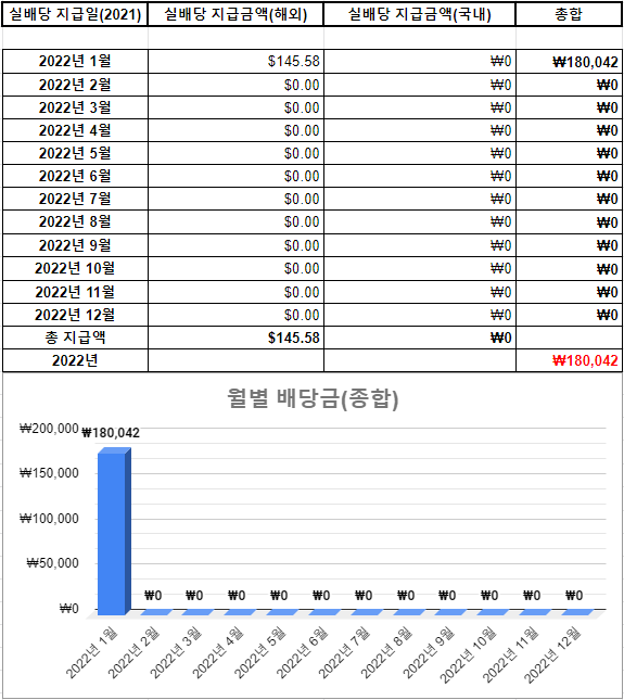 안녕하세요 2030년 경제적 자유를 이루는 파이어2030입니다. 최근 이웃이 되신 분들은 ‘갑자기 이게 뭐지?’라고 의아해하실 수도 있겠지만, 작년 이맘때보다 이웃이 많아졌으니, 조금 말씀드리고 넘어가겠습니다. 제 별명은 Fire 2030 입니다. Fire는 Fire가 아니라 Financial Independent and Early Retire의 약자입니다. 2030은 20대, 30대를 뜻하는 것이 아니라 2030년까지 그 목표를 달성한다는 뜻이다. 네이버에서 ‘파이어 2030’을 검색하면 ‘2030세대 파이어 패밀리를 꿈꾸다’ 같은 글이 계속해서 나오더라구요. 닉네임을 잘못 선택했다고 생각한 적도 많았지만, 계속해서 활동하다 보면 닉네임도 커질 날이 올 거라고 믿습니다. .지난 1년간 휴직 후 RE(조기퇴직)에 대한 생각이 조금 바뀌었지만, 여전히 FI에 대한 확고한 목표(그냥 재정적 독립이라고 부르자)가 있습니다. 경제적 독립을 꿈꾼다면 먼저 자신이나 가족이 매달 생활비로 지출하는 총액이 얼마인지 알 수 있어야 한다. 가계부를 작성하든, 앱을 사용하든, 메모를 하든, 월 평균 지출을 파악하는 것이 중요합니다. 예를 들어 한 달에 총 200만원을 지출한다고 가정해 보겠습니다. 그러면 ‘아, 월급 외에 월 200만원의 현금흐름을 창출할 수 있다면 일을 해도 되고 안 해도 된다’는 것을 알 수 있다. 일이 선택이 되는 순간이 올 수 있습니다. 그 점이 재정적 자립을 위한 금전적 기준이 된다. 월 지출 금액은 개인, 가족마다 다르기 때문에 각자의 상황에 맞게 목표 금액을 설정하시면 됩니다. 가끔 유튜브에서 Fire People이라는 분들이 자주 묻는 질문에 대해 이야기를 하기도 합니다. .”화재 비용은 얼마를 지불하셨나요?” “불을 피우면 돈을 얼마나 벌 수 있나요?” 이 질문에 답할 수 있는 Fire 가족은 없습니다. 이 질문에 답할 수 있는 사람은 바로 당신이다. 당신이 감당할 수 있는 금액이 얼마나 되는지 알 수 있는 유일한 사람은 당신 자신입니다. 제가 생각해낸 계획은 이렇습니다. 모두 급여 이외의 현금 흐름을 나타냅니다. 2022년 월 50만원, 2024년 월 100만원, 2026년 월 200만원, 2028년 월 400만원, 2030년 월 800만원으로 월평균 현금흐름 목표를 달성하였습니다. 작년 연봉 빼고 50만원. (여기에는 여기에 기록되지 않은 국내 주식 및 기타 해외 주식의 배당금도 포함됩니다.) 현재 다음 단계로 나아가고 있습니다. 이것은 당신이 묻는 질문입니다. 2022년, 2024년, 2026년이 있을 수도 있는데… 목표는 2년 단위로 각각 50만원, 100만원, 150만원… 이렇게 금액을 50만원씩 늘려야 하는 거 아닌가요? 투자를 조금만 해보면 이해가 되실 거라 생각합니다. 돈은 덧셈이 아닌 곱셈의 형태로 증가합니다. 이 과정을 블로그에 기록하고 있습니다. 이 기록이 쌓이면 월 50만원이 월 100만원이 되고, 월 100만원이 월 200만원이 되고… 그렇게 현금흐름이 늘어나다 보면 언젠가는 직업이 되는 순간을 맞이하게 될지도 모르겠습니다. 옵션. 이것은 나의 개인적인 기록이자 동시에 비슷한 삶을 꿈꾸는 이들에게 보여주는 과정이기도 하다. 결과는 누구나 쉽게 이야기할 수 있지만 과정은 과정이다. 그렇지 않습니다. 시간이 걸린다. 나보다 먼저 가신 분에게서 보고 싶은 과정의 형태로 무언가를 남기고 있는 것입니다. 이런 이유로 나는 한 달에 한 번씩 미국 주식을 소유함으로써 발생하는 배당금을 기록합니다. 이번 달은 2023년의 마지막 기록이자 한 해를 정리하는 포스팅입니다. 먼저 12월 배당 현황을 살펴보겠습니다. (모든 금액은 세전 금액으로 표시됩니다. 아직 큰 금액은 아니지만 크게 보이도록 하고 싶지만, 2024년부터는 2023년부터 세후 금액으로 표시됩니다.) 미국을 통해 받은 배당금 총액 2023년 12월의 주식 가격은 $338.11입니다. 네이버 환율로 환산하면 43만원이 조금 넘는다.