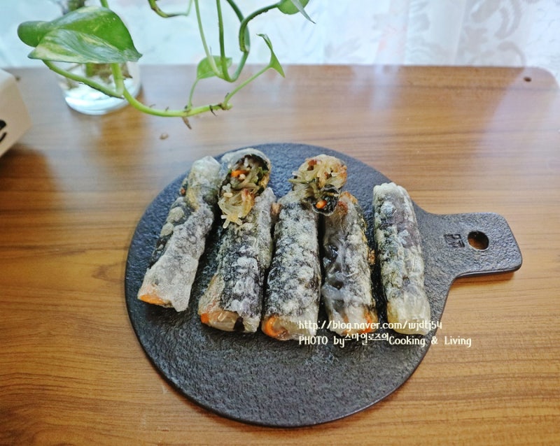 오늘은 냉동실에 얼려 있던 잡채를 꺼내서 김말이를 만들어 봤습니다. 김말이를 만들려면 당면을 불려야 하는데 남은 잡채를 활용했더니 초간단해요. 남은 잡채는 얼려서 먹어도 괜찮을 것 같아서 지난번에 남편 생일선물로 잔뜩 만들어서 나누어 먹었어요. 그때 이 메뉴를 염두에 두고 당면 비율을 많이 넣어서 만들었는데 딱 맞았네요^^