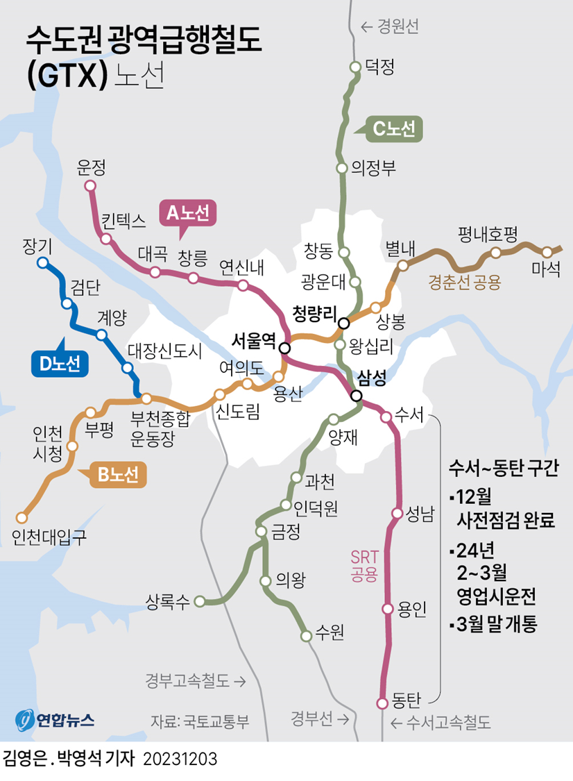 수도권 고속철도는 파주 운정에서 출발해 서울역과 삼성역을 거쳐 동탄을 연결한다.